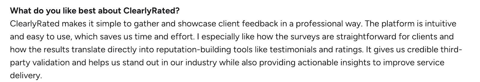 • For firms wanting structured, actionable feedback that strengthens client relationships and grows loyalty, ClearlyRated can be a game-changer.