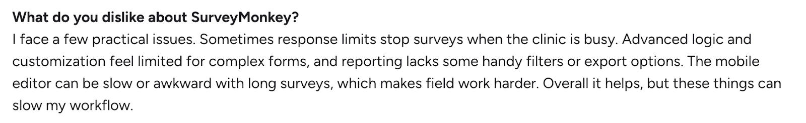 For instance, while using SurveyMonkey, a user noted several limitations, including response caps that interrupt data collection, restricted logic for complex surveys, and reporting tools that lack advanced filters or export flexibility.