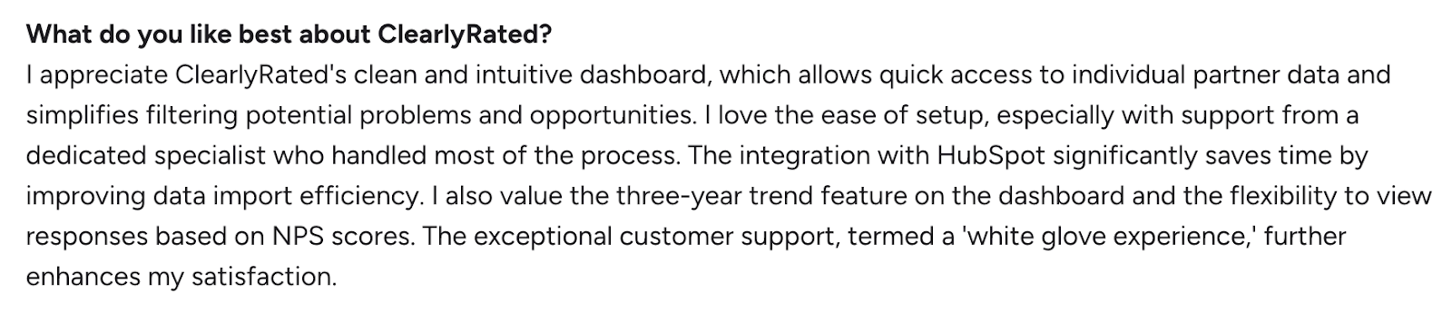 One G2 user praised ClearlyRated’s clean and intuitive dashboard, which allows quick access to partner-level data and simplifies the filtering of potential issues and opportunities. The G2 user also described customer support as a white-glove experience that significantly enhanced overall satisfaction.